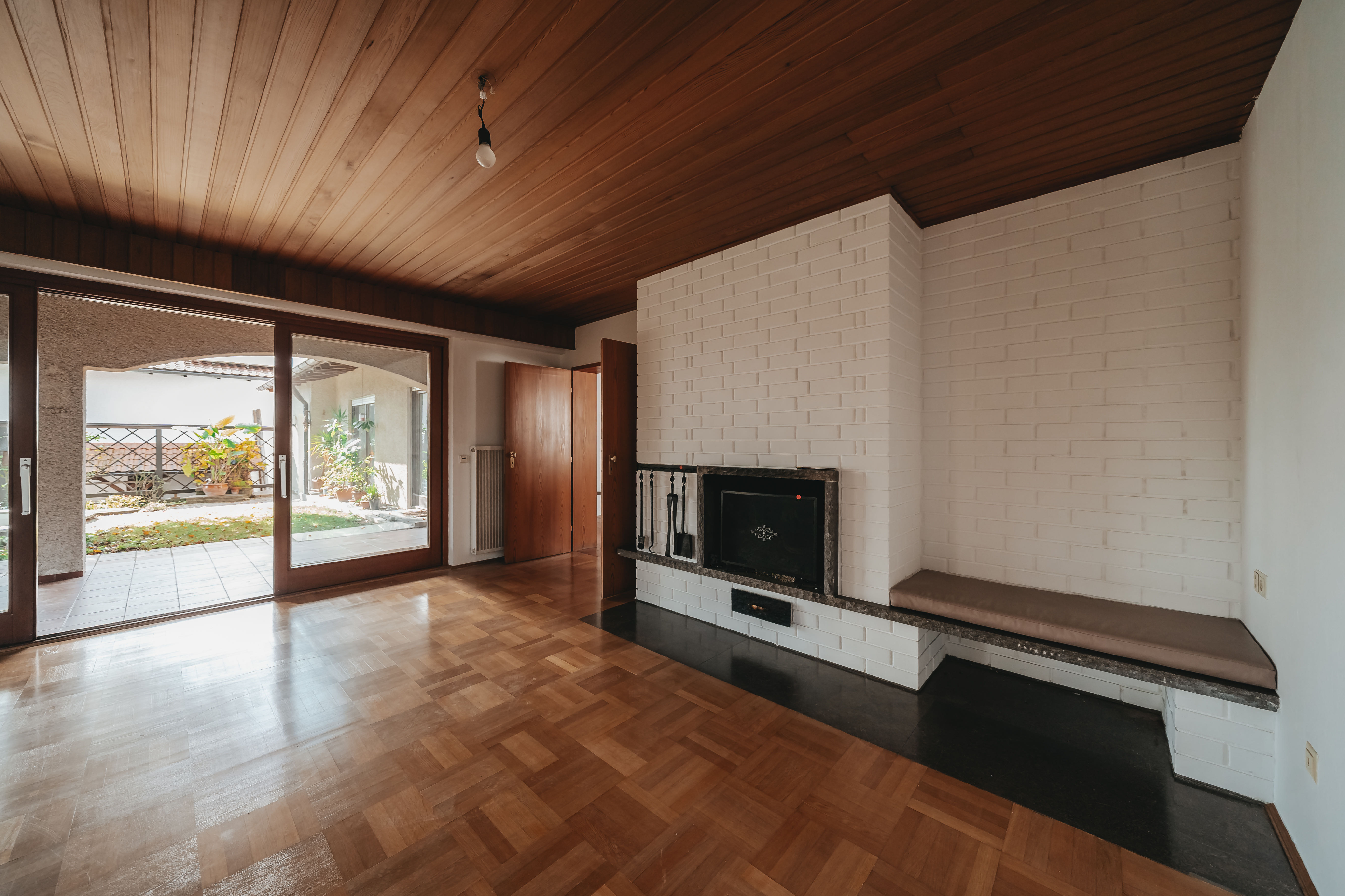 Die Küche ist mit einer Einbauküche ausgestattet und grenzt direkt an das geräumige Esszimmer, das ausreichend Platz für einen großen Esstisch bietet. Von hier gelangt man in das lichtdurchflutete Wohnzimmer mit offenem Kamin, das durch seine behagliche Atmosphäre und den direkten Zugang zur Terrasse besticht. Drei weitere Zimmer können flexibel als Schlaf-, Kinder- oder Arbeitszimmer genutzt werden. Das Tageslichtbad ist mit Badewanne, Dusche und Doppelwaschbecken ausgestattet; ein separates Gäste-WC ergänzt den Grundriss im Erdgeschoss.