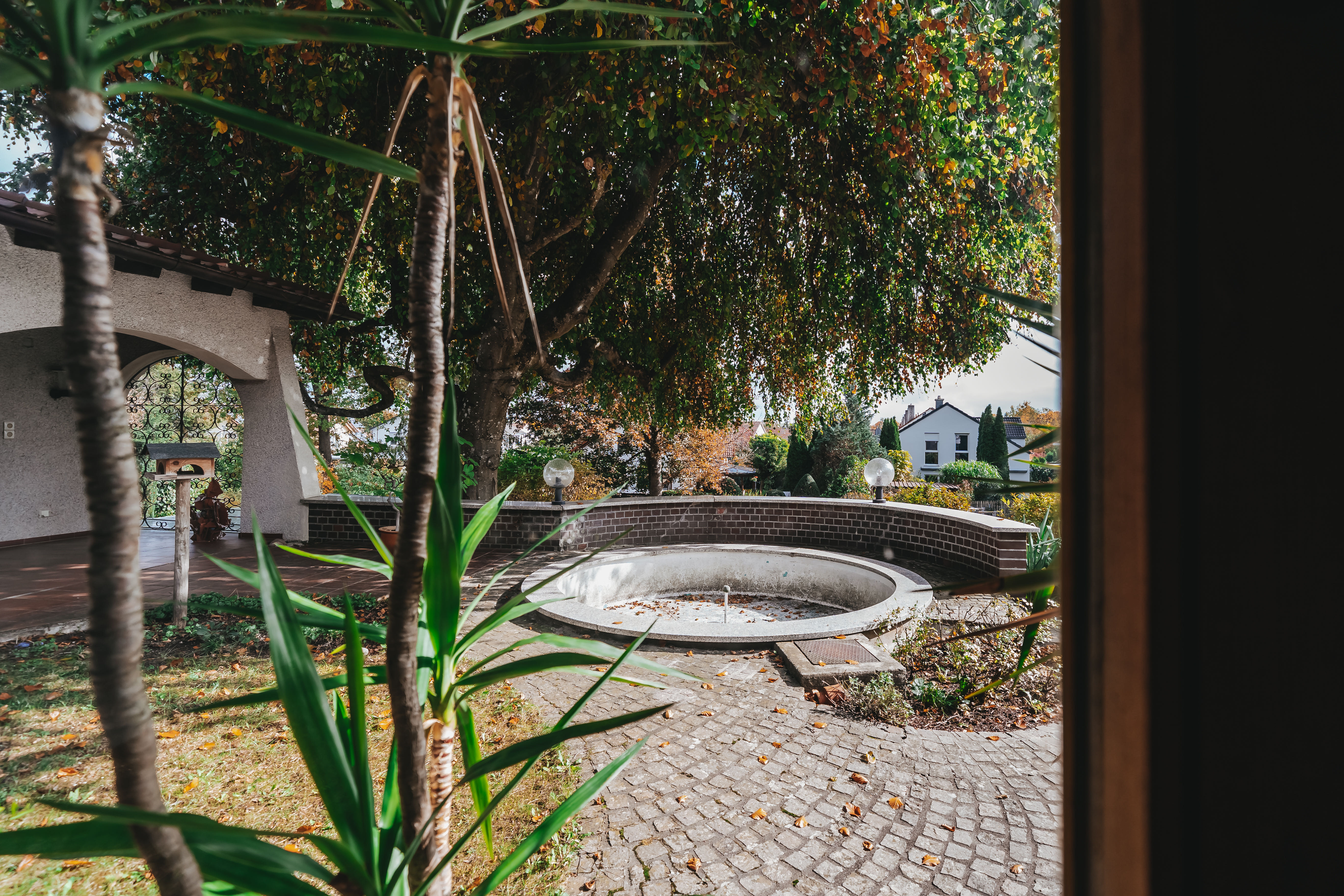 Der liebevoll gestaltete Garten mit gepflegter Rasenfläche und einem kleinen Brunnen verleiht dem Außenbereich eine parkähnliche Atmosphäre – ein Ort der Ruhe und Entspannung.