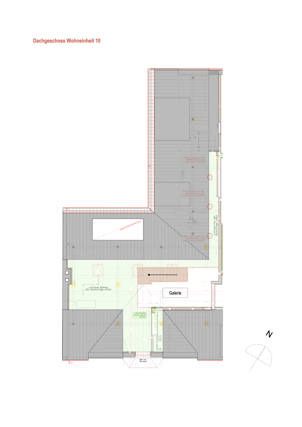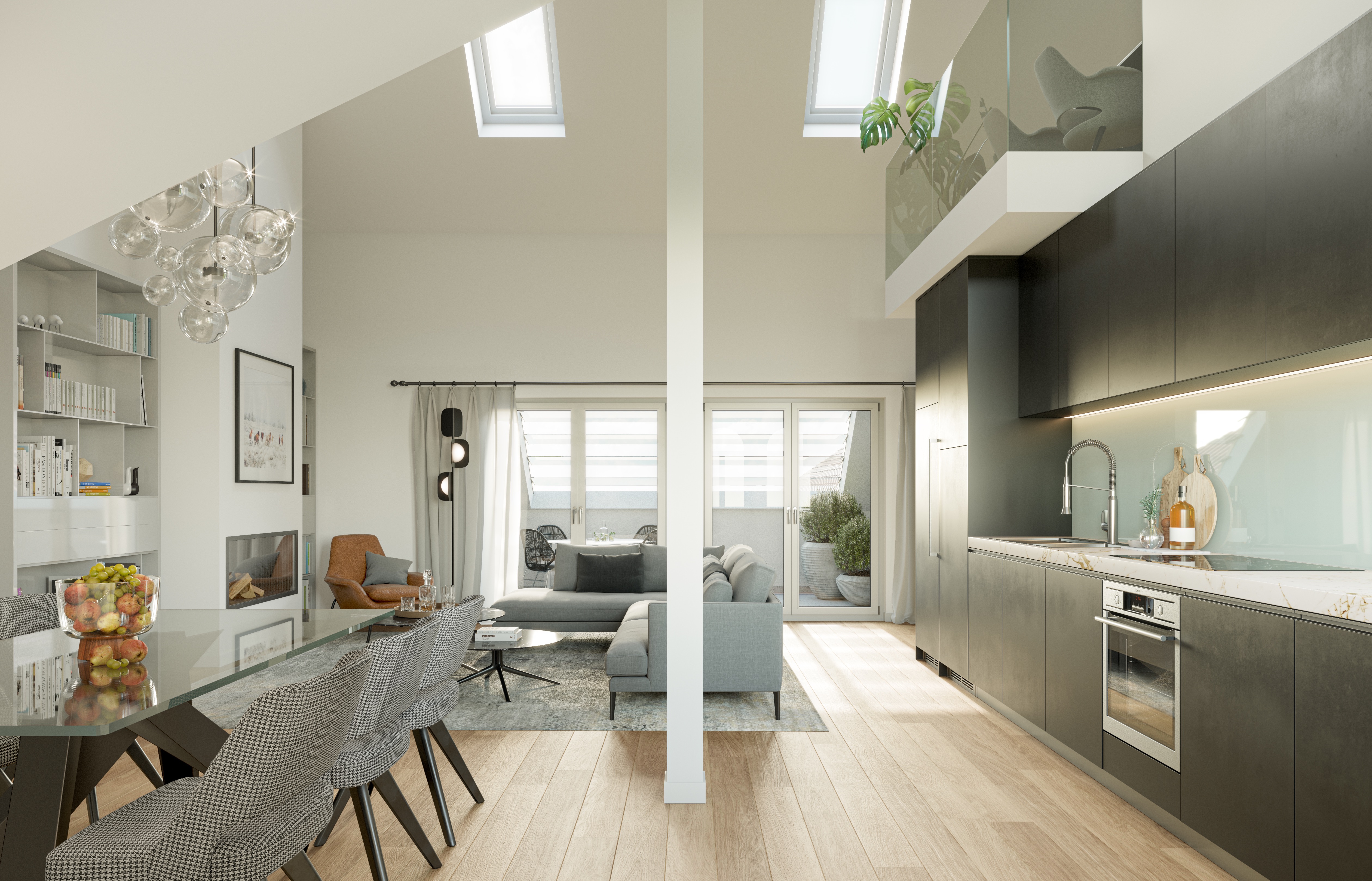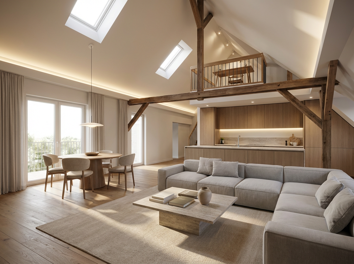 Im weiteren Verlauf öffnet sich der Flur zum beeindruckenden Wohn- und Essbereich. Der offene Dachstuhl mit freigelegten Holzbalken sowie die großzügige Fensterfront verleihen dem Raum ein außergewöhnlich großzügiges und luftiges Ambiente. Die Anschlüsse für einen offenen Küchenbereich sind bereits vorbereitet und lassen sich harmonisch in das Wohnkonzept integrieren. Gemeinsam mit dem Wohn- und Essbereich entsteht hier der Mittelpunkt der Wohnung. Viel Tageslicht und die offene Raumgestaltung unterstreichen die besondere Atmosphäre des Wohnbereichs.