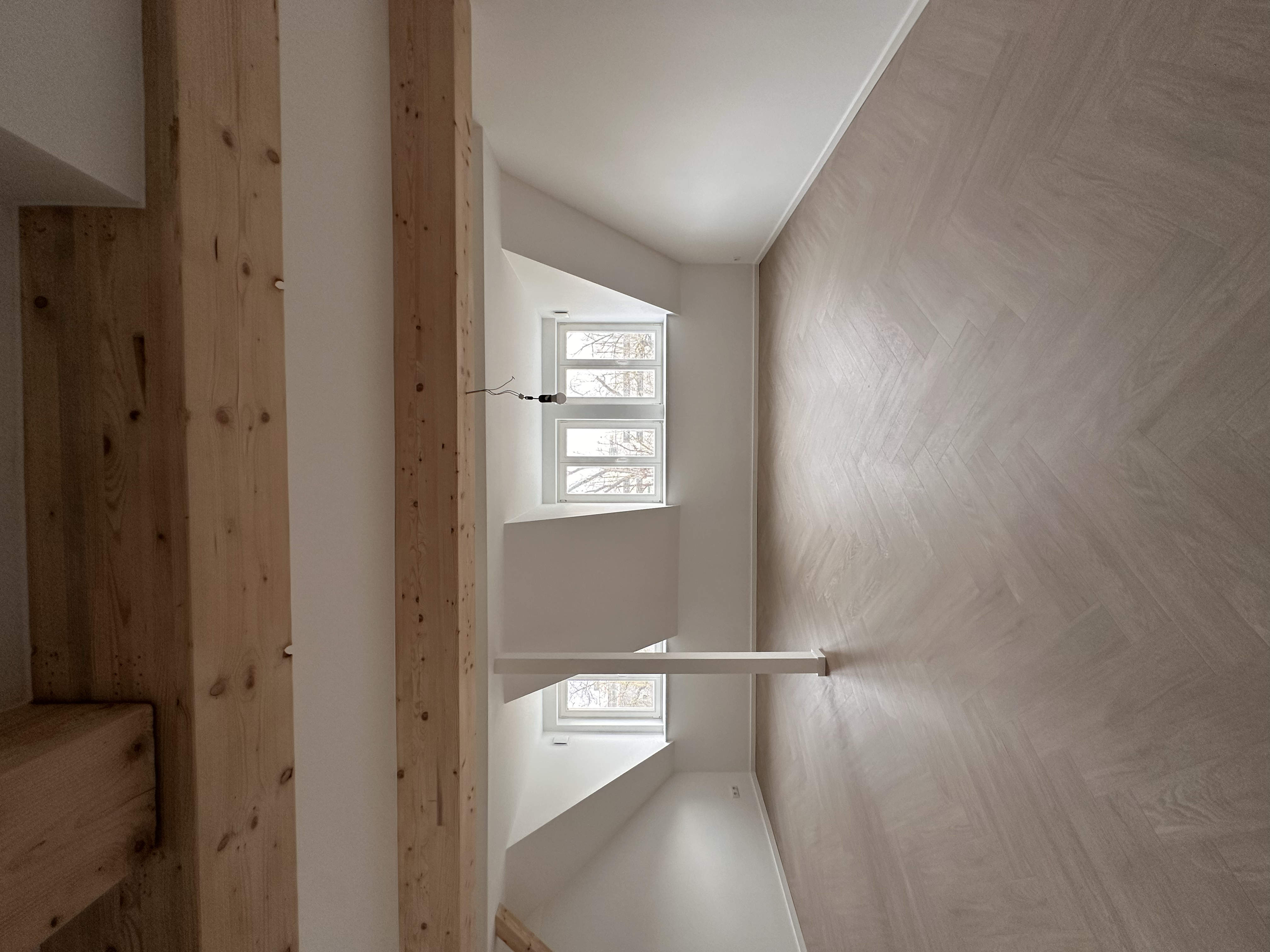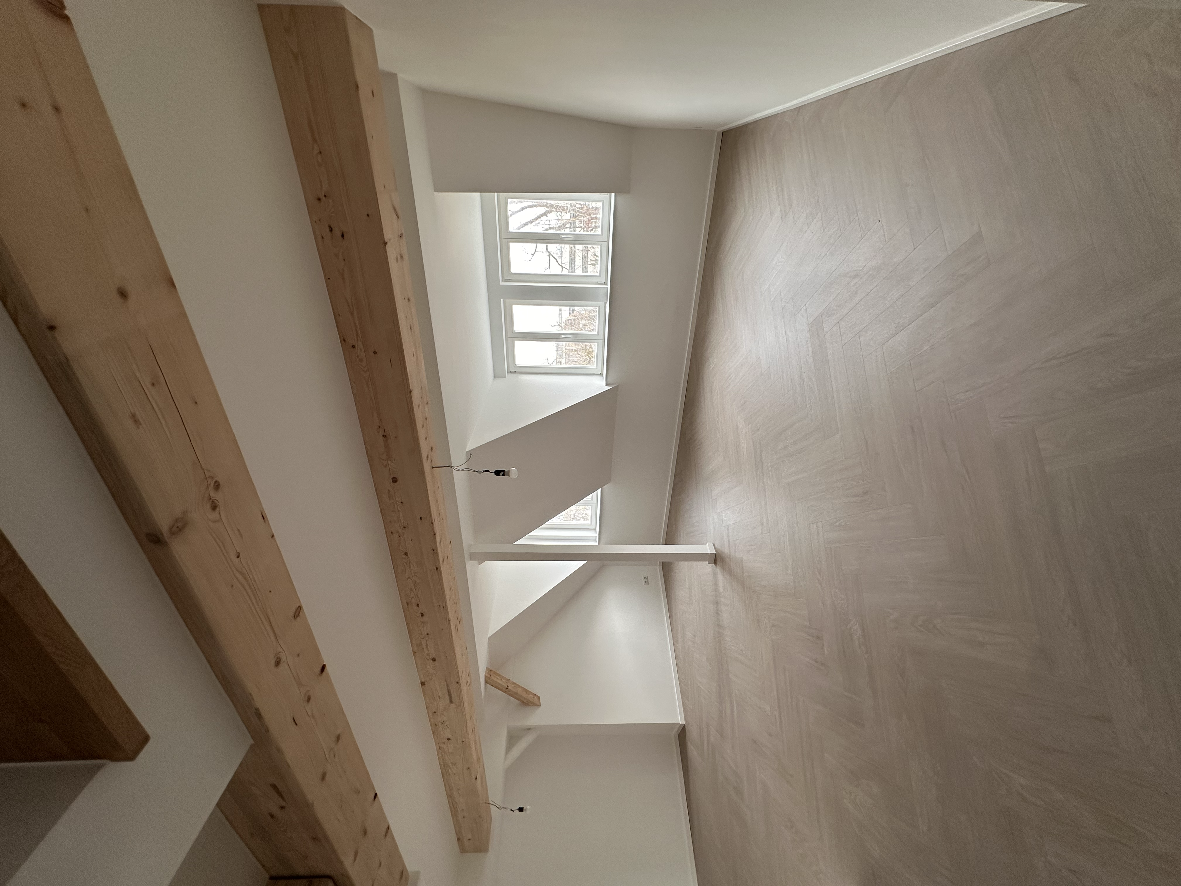 Entlang des Flurs öffnet sich der großzügige Wohn- und Essbereich. Freigelegte Holzbalken, viel Tageslicht und die offene Raumgestaltung verleihen dem Raum eine besondere Atmosphäre und machen ihn zum Mittelpunkt der Wohnung.